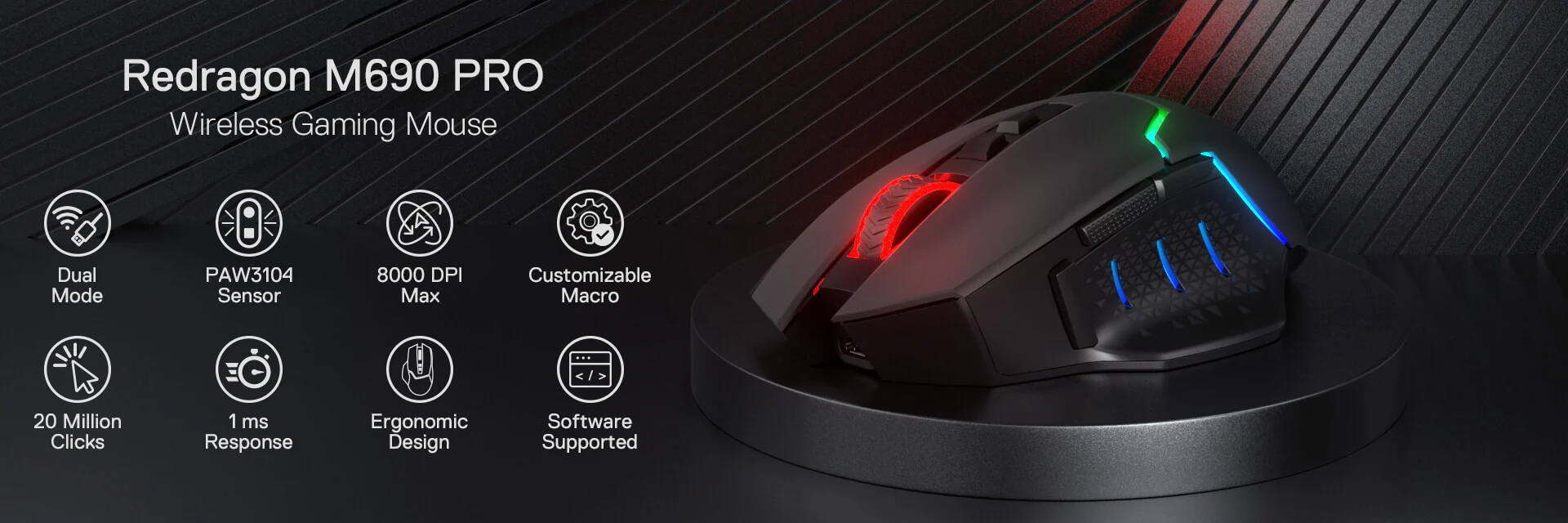 The REDRAGON MIRAGE M690 PRO MOUSE utilizes 2.4GHz wireless technology for a lag-free experience with a range of up to 10 meters (30 feet). Enjoy uninterrupted gameplay and precise control, ensuring your actions are registered accurately and timely, giving you the competitive edge you need.